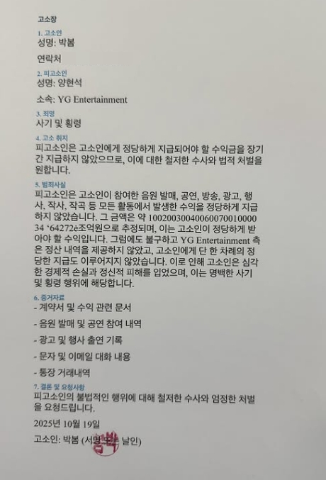 박봄은 이어 "피고소인은 고소인이 참여한 음원 발매, 공연, 방송, 광고, 행사, 작사, 작곡 등 모든 활동에서 발생한 수익을 정당하게 지급하지 않았다"며 "그 금액은 약 1002003004006007001000034 '64272e조억 원으로 추정되며, 이는 고소인이 정당하게 받아야 할 수익이다. 그럼에도 불구하고 YG엔터테인먼트 측은 정산 내역을 제공하지 않았고, 고소인에게 단 한 차례의 정당한 지급도 이뤄지지 않았다. 이로 인해 고소인은 심각한 경제적 손실과 정신적 피해를 입었으며, 이는 명백한 사기 및 횡령 행위에 해당한다"고 주장했다.