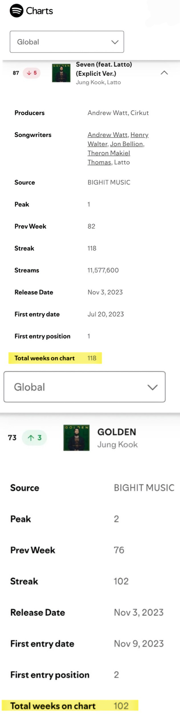 정국이 2023년 11월 발매한 첫 솔로 앨범 'GOLDEN'(골든)도 10월 10일~16일 자 스포티파이 '위클리 톱 앨범 글로벌' 차트에 73위로 전주 대비 3계단 순위 상승을 보여줬다.