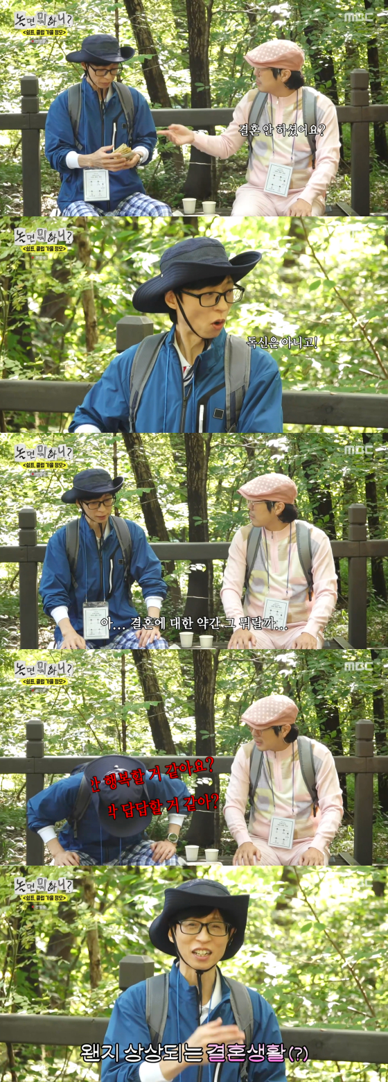 그러자 하하는 유재석에게 "결혼 안 하셨냐. 독신주의자냐"고 응수했다. 유재석은 "싱글인데 독신주의는 아니고, 결혼에 대한 약간 뭐랄까"라며 답변을 이어가지 못했다.