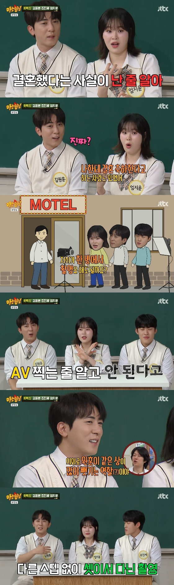 코미디언 엄지윤이 과거 에로배우로 오해받았던 일화를 깜짝 공개했다. 25일 방송된 JTBC 예능 프로그램 '아는 형님'에는 스케치 코미디 채널 '숏박스'를 통해 대세로 떠오른 코미디언 김원훈, 조진세, 엄지윤이 출연해 유쾌한 입담을 뽐냈다.
