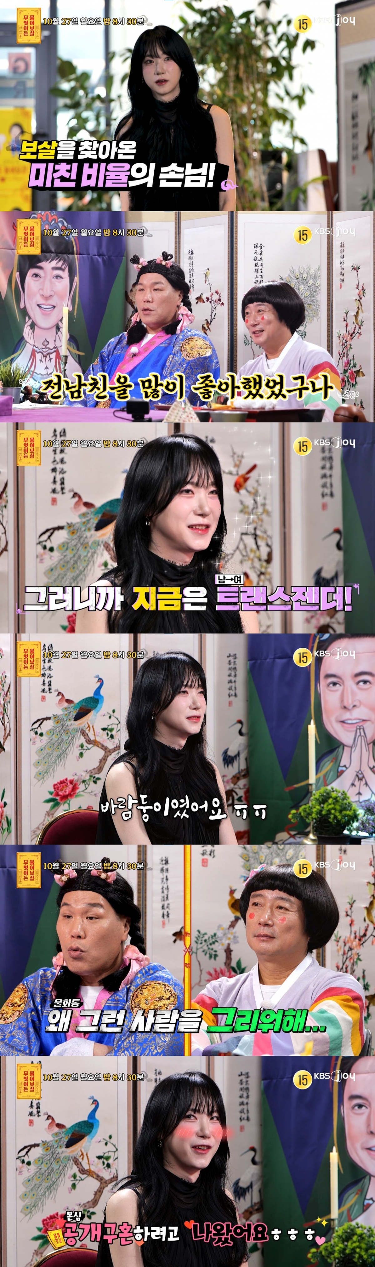 27일 밤 8시 30분 방송되는 KBS Joy '무엇이든 물어보살' 338회에는 트랜스젠더 사연자가 출연해 3년 반 동안 교제했던 전 남자친구를 아직도 잊지 못하고 있다며 고민을 털어놓는다.