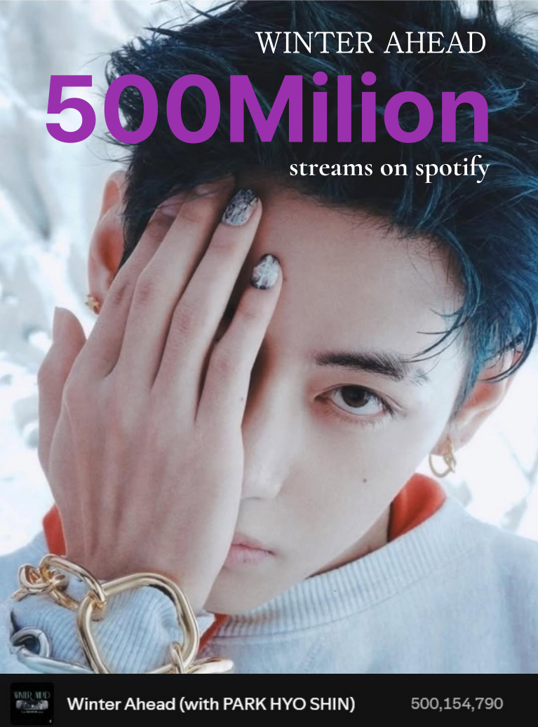 방탄소년단(BTS) 뷔의 '윈터 어헤드'가 스포티파이(Spotify)에서 5억 스트리밍을 돌파하며 인기를 빛냈다.뷔가 박효신과 협업한 '윈터 어헤드'(Winter Ahead(with Park Hyoshin))가 세계 최대 음원 플랫폼 스포티파이에서 5억 스트리밍을 돌파했다.