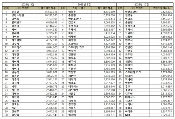 2025년 10월 스타 브랜드평판 30위 순위는 방탄소년단, 임영웅, 아이브, 손흥민, 블랙핑크, 유재석, 트와이스, 김용빈, 변우석, 류현진, 김연경, 전현무, 조우진, 이채민, 세븐틴, 이병헌, 박지현, 스트레이 키즈, 페이커, 박나래, 박진영, 우즈, 조용필, 김우빈, 데이식스, 김고은, 샤이니, 추성훈, 아이들, NCT 순으로 분석됐다.