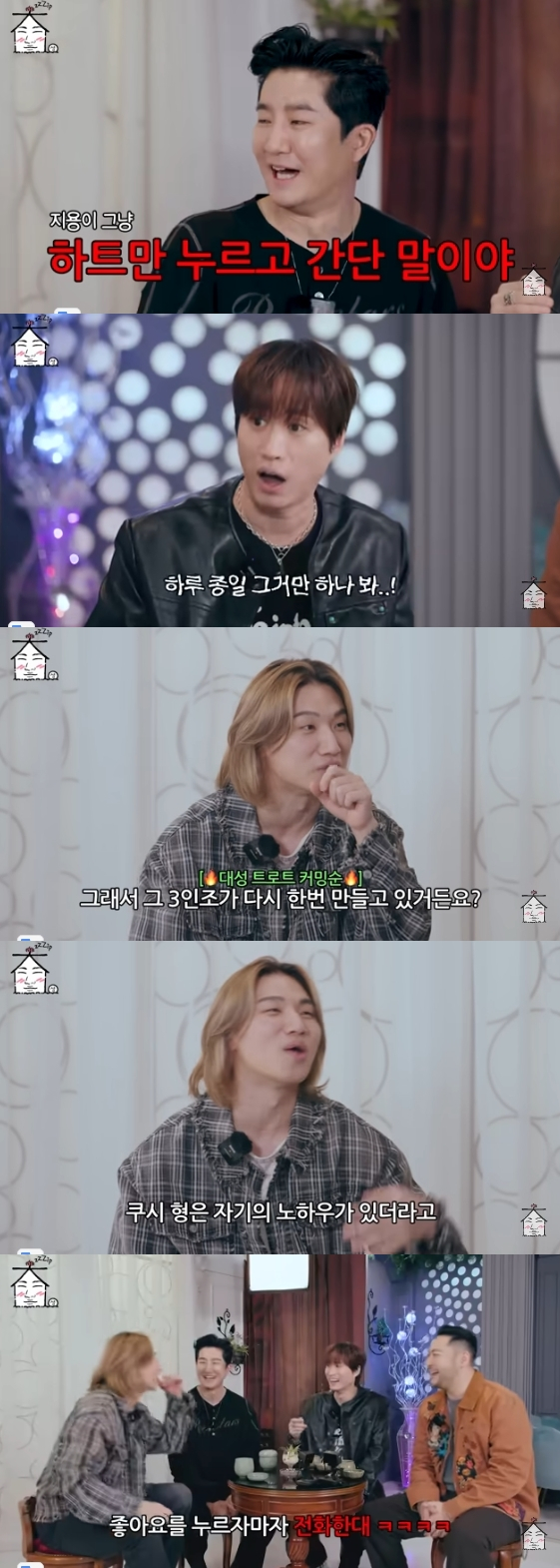 그러자 대성은 지드래곤과 얽힌 에피소드를 털어놔 시선을 모았다. 그는 "가끔 형님이 급하게 뭔가를 정해야 하는데 연락이 더딜 때가 있다. 원래 '날 봐 귀순'이 지드래곤, 쿠시, 대성 3인조가 한 거다. 그걸 한번 부활시켜보자고 해서 다시 3인조가 만들고 있다. 컨펌이 안 떨어져서 용사마한테 연락해야 하는데 쿠시 형한테 연락했다"라고 입을 열었다. 이어 "쿠시 형은 자기만의 노하우가 있다면서 인스타그램을 보다가 지용이 형이 '좋아요'를 누르자마자 전화한다고 한다. 그러면 받는다더라"라고 말해 현장을 웃음바다로 만들었다.