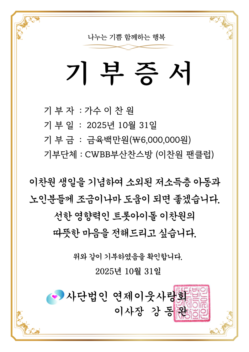 가수 이찬원의 팬들이 기부로 선한 영향력을 실천했다. 이찬원 팬클럽 CWBB부산찬스방은 11월 1일 이찬원의 생일을 기념해 10월 31일 사단법인 연제이웃사랑회에 600만 원을 기부했다.