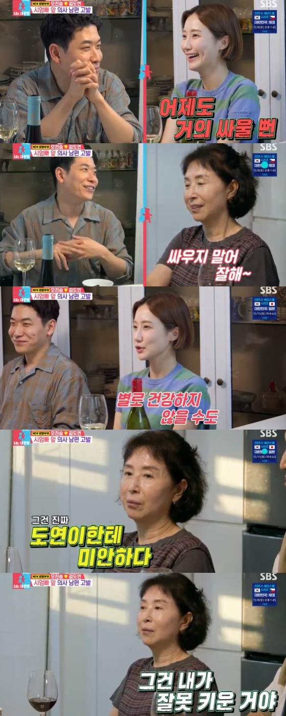 김도연은 "싸우지 않은 관계는 별로 건강하지 않을 거 같다"라고 전했다. 그러면서 그는 오진승에 대해 "물건 정리가 진짜 안 된다. 이거 때문에 진짜 많이 싸운다"라고 폭로했다. 이에 시어머니는 "내 아들이 그런 줄 몰랐다. 그건 진짜 도연이한테 미안하다. 그건 내가 잘못 키운 거야. 내 발등 찍은 거다. 내가 잘못 키웠어. 미안해"라고 사과했다.
