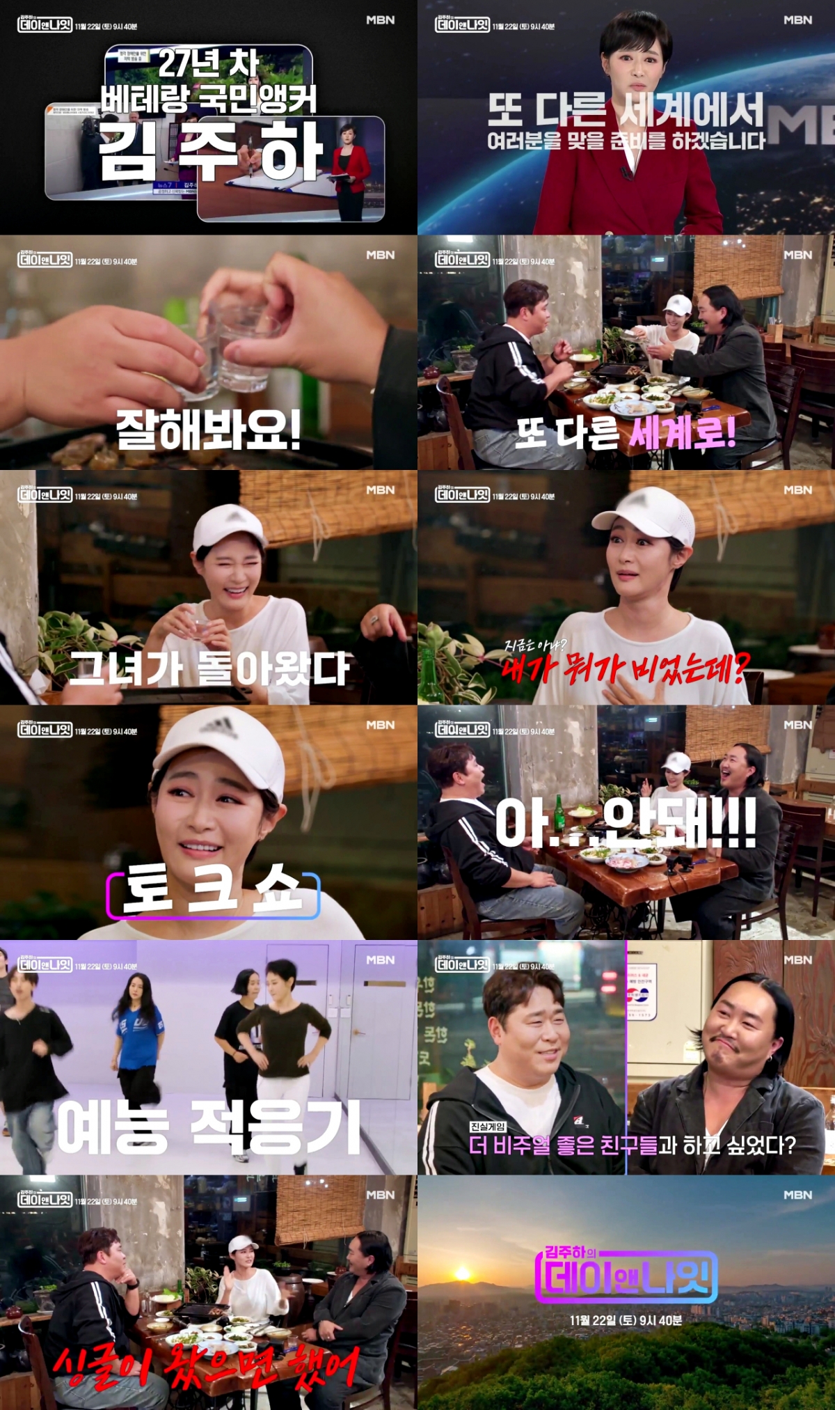 MBN 김주하 아나운서가 '김주하의 데이앤나잇'에서 화끈한 입담을 예고했다.MBN '김주하의 데이앤나잇'은 '낮과 밤, 냉정과 열정, 정보와 감동'을 내세운 신개념 이슈메이커 토크쇼다. 매거진 오피스 '데이앤나잇' 편집국을 콘셉트로 김주하가 편집장, 개그맨 문세윤과 가수 조째즈가 에디터가 되어 각계각층 셀럽들을 인터뷰하고 다양한 현장을 직접 취재하는 형식을 통해 새로운 형태의 '토크테인먼트'를 선보인다.