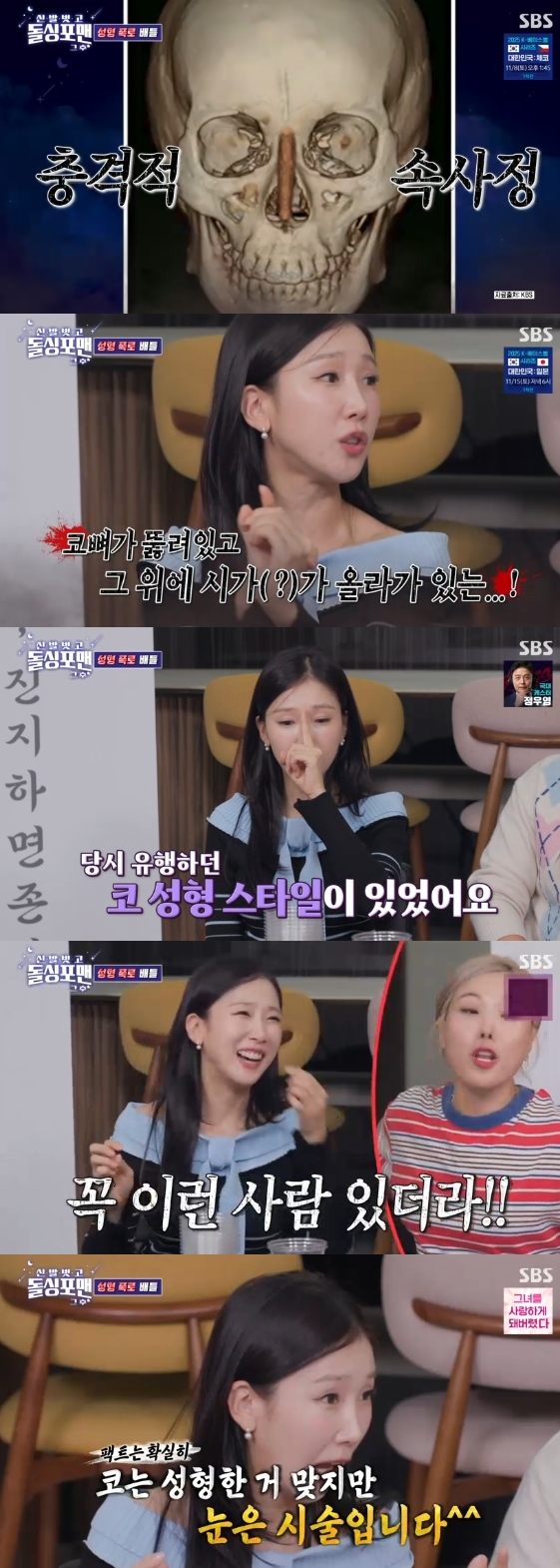 그러자 신봉선은 "당당하게 성형했으면 했다고 말하라"라고 버럭했고, 박소영은 "코는 성형한 게 맞지만 눈은 시술이다"라고 재차 강조해 웃음을 안겼다.