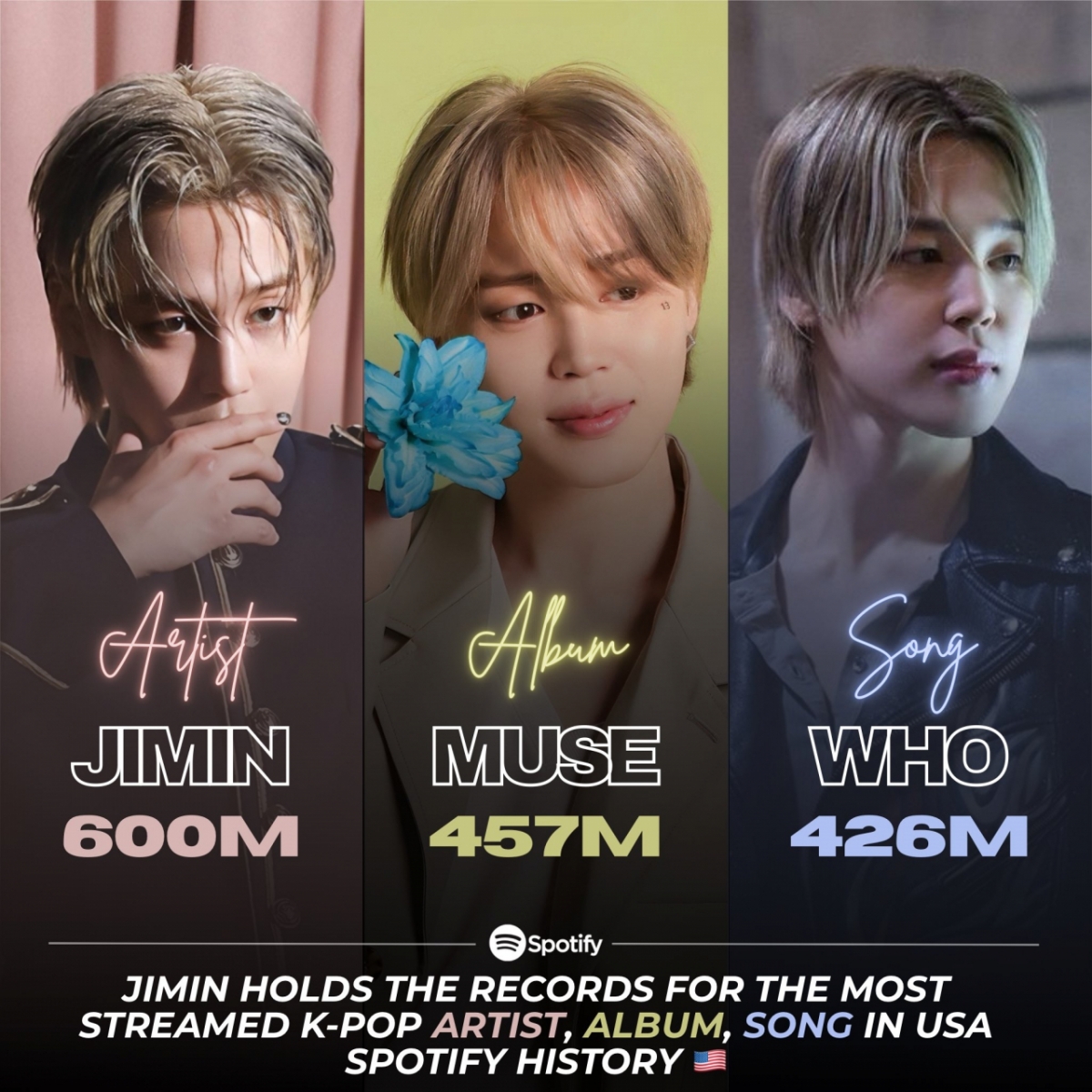 스포티파이 미국 차트에서 4억 5000만 스트리밍을 돌파한 최초이자 유일한 K팝 앨범의 기록을 세운 지민의 2집 'MUSE'(뮤즈)는 스포티파이 미국 '위클리 톱 앨범' 차트에서 59주를 보낸 최초이자 유일한 K팝 솔로 앨범으로 막강한 현지 인기를 증명하고 있다.해외 유명 아티스트와의 협업 없이 스포티파이 미국 '데일리 톱 송' 차트 1위에 오른 최초이자 유일한 K팝 가수의 솔로곡 기록을 세운 지민의 'Who' 는 지난 10월 25일 자 해당 차트에서 450일간의 차트인에 성공, 이는 K팝 가수의 솔로곡 중 최초이자 유일한 기록이다.
