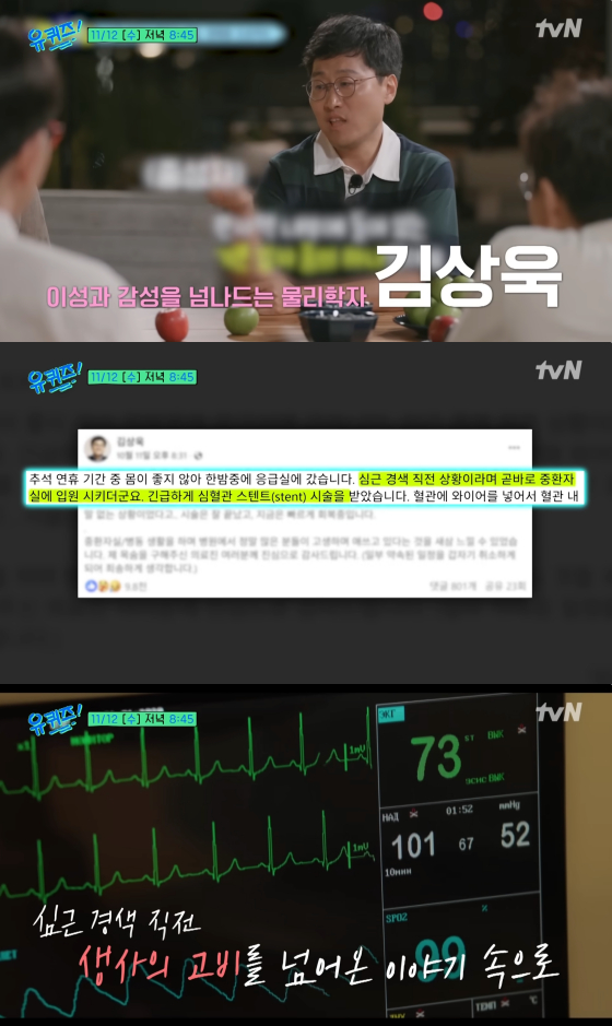 긴급 심혈관계 시술을 받은 김상욱 교수가 '유퀴즈'에 출연한다.지난 5일 방송된 tvN 예능 프로그램 '유 퀴즈 온 더 블럭' 말미에는 물리학자 김상욱 교수의 모습이 담긴 예고편이 공개됐다.