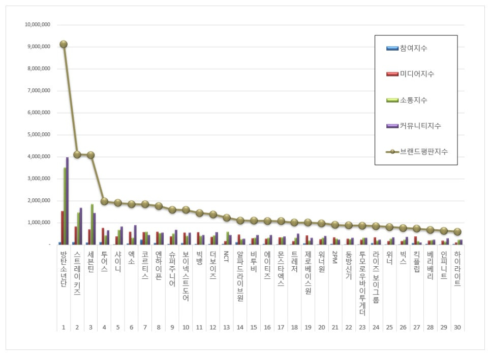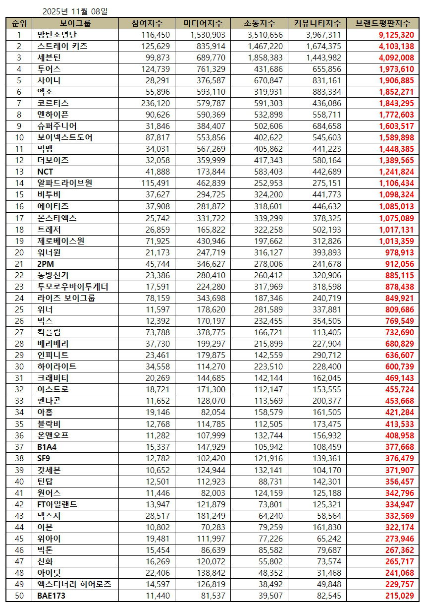 2025년 11월 보이그룹 브랜드평판 30위 순위는 방탄소년단, 스트레이 키즈, 세븐틴, 투어스, 샤이니, 엑소, 코르티스, 엔하이픈, 슈퍼주니어, 보이넥스트도어, 빅뱅, 더보이즈, NCT, 알파드라이브원, 비투비, 에이티즈, 몬스타엑스, 트레저, 제로베이스원, 워너원, 2PM, 동방신기, 투모로우바이투게더, 라이즈 보이그룹, 위너, 빅스, 킥플립, 베리베리, 인피니트, 하이라이트 순으로 분석됐다.