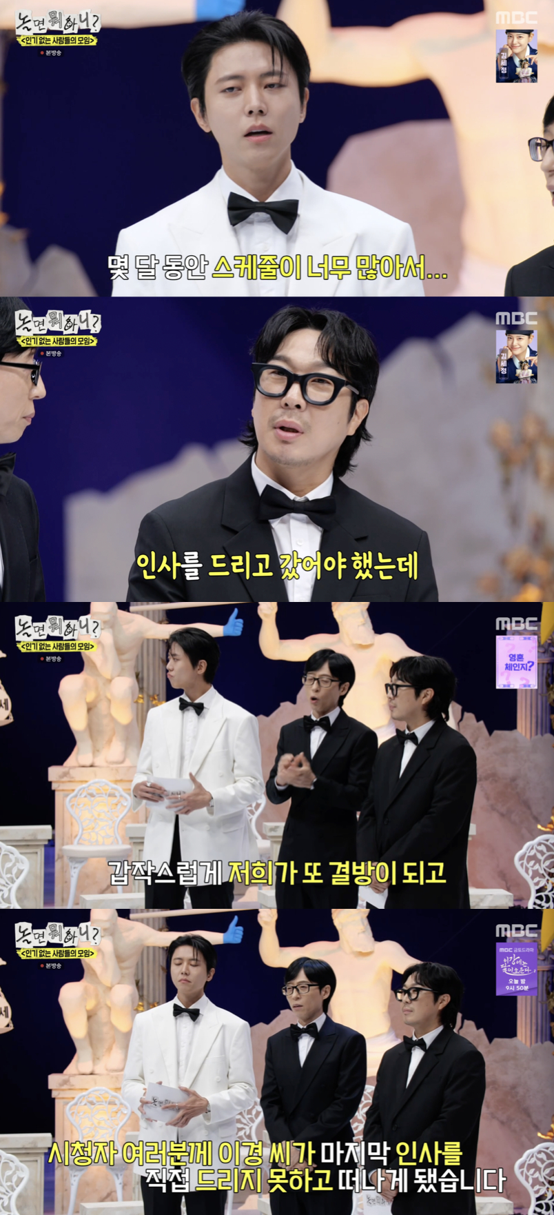 유재석은 "다들 아시겠지만 지금까지 3년여 동안 이경 씨가 우리와 함께 고생을 했다. 기사를 통해 이미 많은 분들이 알고 계시겠지만, 지금 드라마·영화 스케줄이 굉장히 많아서 제작진과 조율을 하다가 이번 스케줄 이후로 '놀면 뭐 하니?'를 하차하게 됐다"라며 "그동안 이경이가 고생을 많이 했다"고 전했다.
