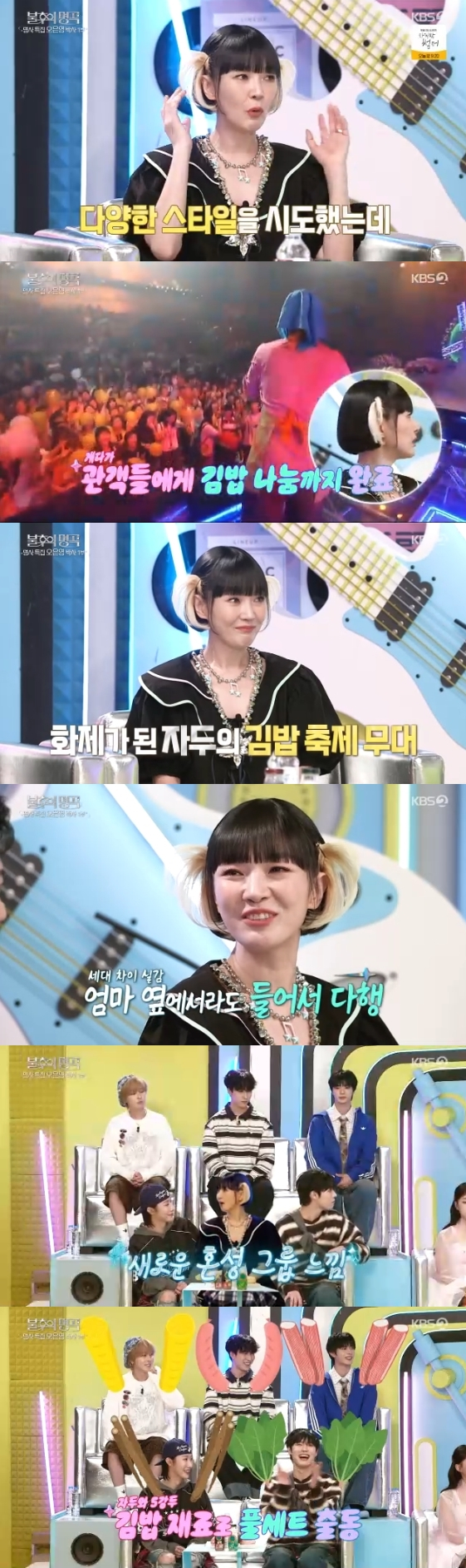 그런가 하면 그룹 원위의 용훈은 "엄마가 김밥과 떡볶이를 해주실 때마다 '잘 말아줘' 노래가 자동 재생된다"라고 고백했다. 이에 자두는 "엄마 옆에서라도 들어서 다행이다. 저는 구전가요가 되는 게 좋다"라고 너스레를 떨어 모두를 폭소케 했다.