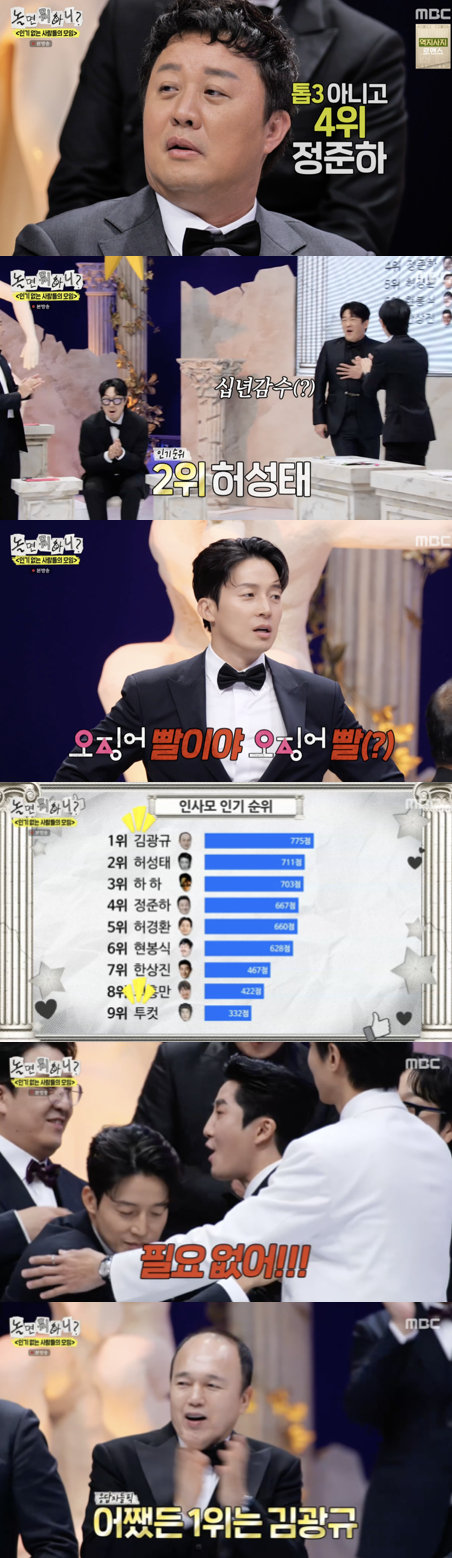 2위는 '오징어 게임'으로 세계적인 인기를 얻은 허성태가 차지했다. 이를 본 허경환은 "'오징어게임' 빨이야"라며 질투 섞인 반응을 보였다. 반면 최홍만은 8위를 기록하며 충격을 감추지 못했다.가장 높은 순위인 1위는 김광규였다. 그는 최근 출연한 tvN 화제작 '폭군의 셰프'를 언급하며 "드라마 덕분"이라며 겸손한 태도를 보였고, 주우재는 "김광규 결혼할 수 있겠다"고 농담해 웃음을 자아냈다.
