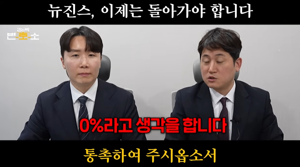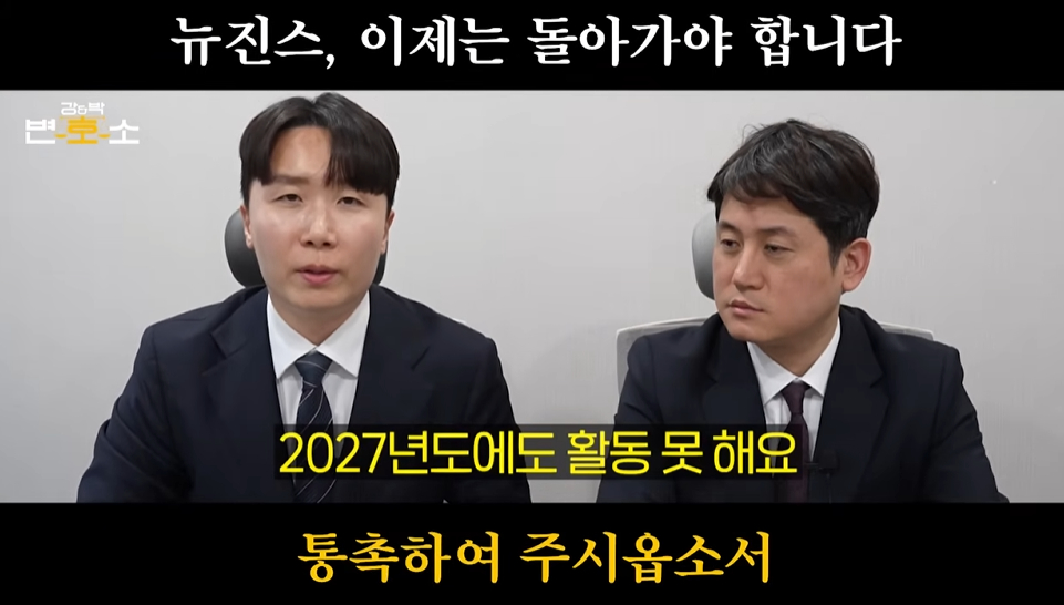 유튜브 채널 '강앤박 변호소'는 8일 '2027년까지 뉴진스를 못 볼 수도 있는 이유'라는 제목의 영상을 게재했다. 영상에서 강호석 박건호 변호사는 뉴진스와 소속사 어도어의 전속계약 관련 분쟁에 대한 생각을 밝혔다.