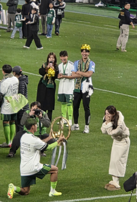 공개된 사진에는 전북 현대 모터스 송민규 선수가 곽민선을 향해 그라운드 위에서 무릎을 꿇고 K리그1 우승 트로피를 건네고 있다.