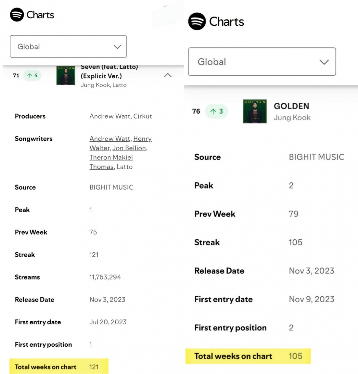 정국이 2023년 발매한 솔로 데뷔곡 'Seven'(세븐)은 세계 최대 음원 스트리밍 플랫폼 스포티파이(Spotify) 10월 31일~11월 6일 자 '위클리(주간) 톱 송 글로벌' 차트에 71위를 차지했다.