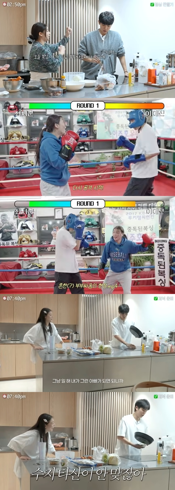 복싱장에 도착한 두 사람은 스파링에 나섰고, 서로에게 주먹을 날리며 폭풍 펀치를 선보였다. 에일리는 "바지를 왜 컴퓨터 방에 벗어놨어! 왜 아무 데나 벗어놔! 어딜 도망가!"라고 소리쳐 현장을 웃음바다로 만들었다. 이후 집으로 돌아와 저녁 식사 준비를 하던 두 사람은 가족들을 위해 삼시 세끼를 만드는 어머니들의 노고를 위로했다. 이때 에일리가 "나도 그런 엄마가 될 수 있을까?"라고 묻자 최시훈은 "자기는 일해. 내가 그런 아빠가 되면 되지. 뭐 하러 그래. 수지 타산이 안 맞잖아"라고 대꾸해 모두를 폭소케 했다.