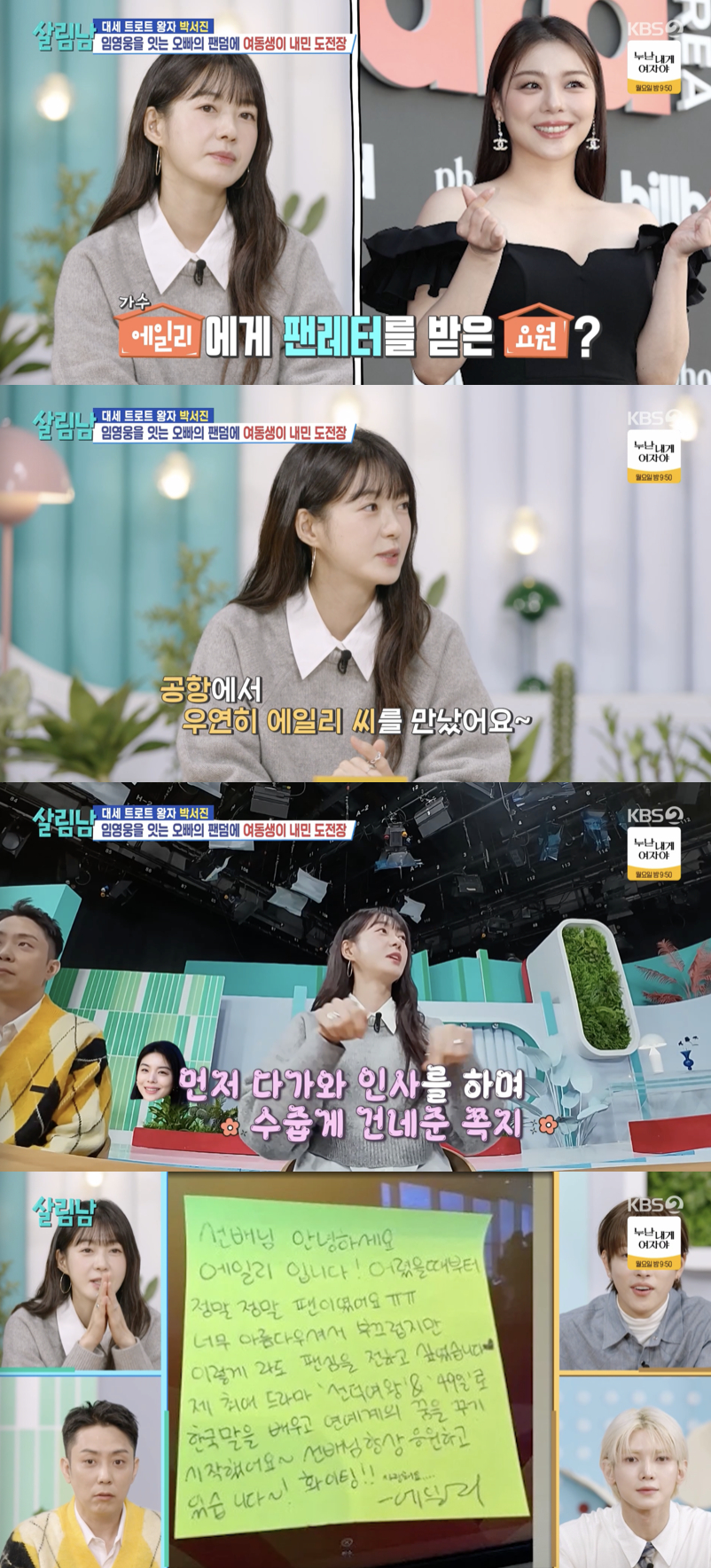 배우 이요원이 가수 에일리에게 받은 '손글씨 팬레터' 사연을 공개했다.15일 방송된 KBS 2TV '살림하는 남자들 시즌2'에서는 MC 이요원이 예상치 못한 팬레터 경험을 전하며 눈길을 모았다.