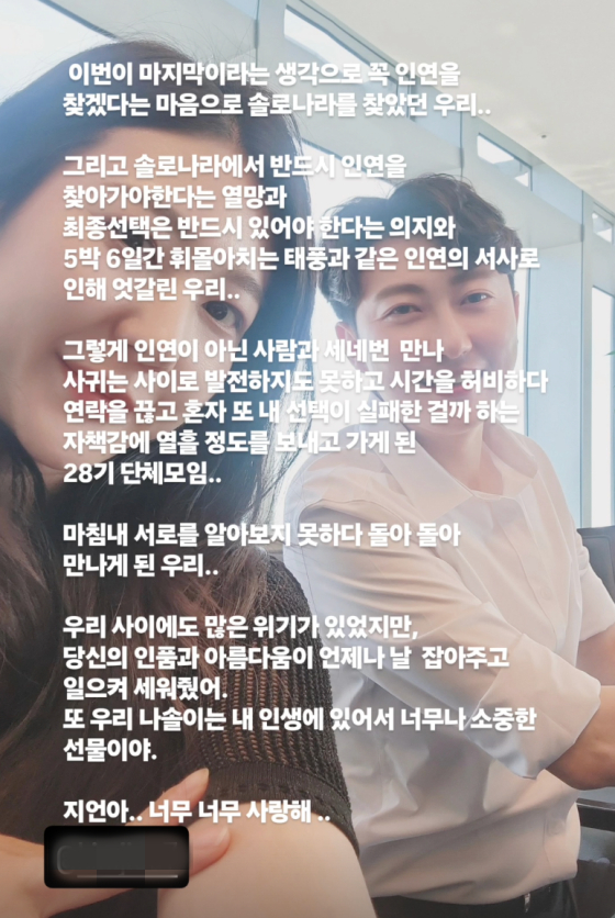 이어 "그렇게 인연이 아닌 사람과 서네 번 만나 사귀는 사이로 발전하지도 못하고 시간을 허비하다 연락을 끊고 혼자 또 내 선택이 실패한 걸까 하는 자책감에 열흘 정도를 보내고 가게 된 28기 단체 모임. 마침내 서로를 알아보지 못하다 돌아 돌아 만나게 된 우리"라고 정숙과 연인이 된 시점을 언급했다.그러면서 "우리 사이에도 많은 위기가 있었지만 당신의 인품과 아름다움이 언제나 날 잡아주고 일으켜 세워줬다. 또 우리 나솔이는 내 인생에 있어서 너무나 소중한 선물이야. 너무 너무 사랑해"라고 애정을 고백했다.