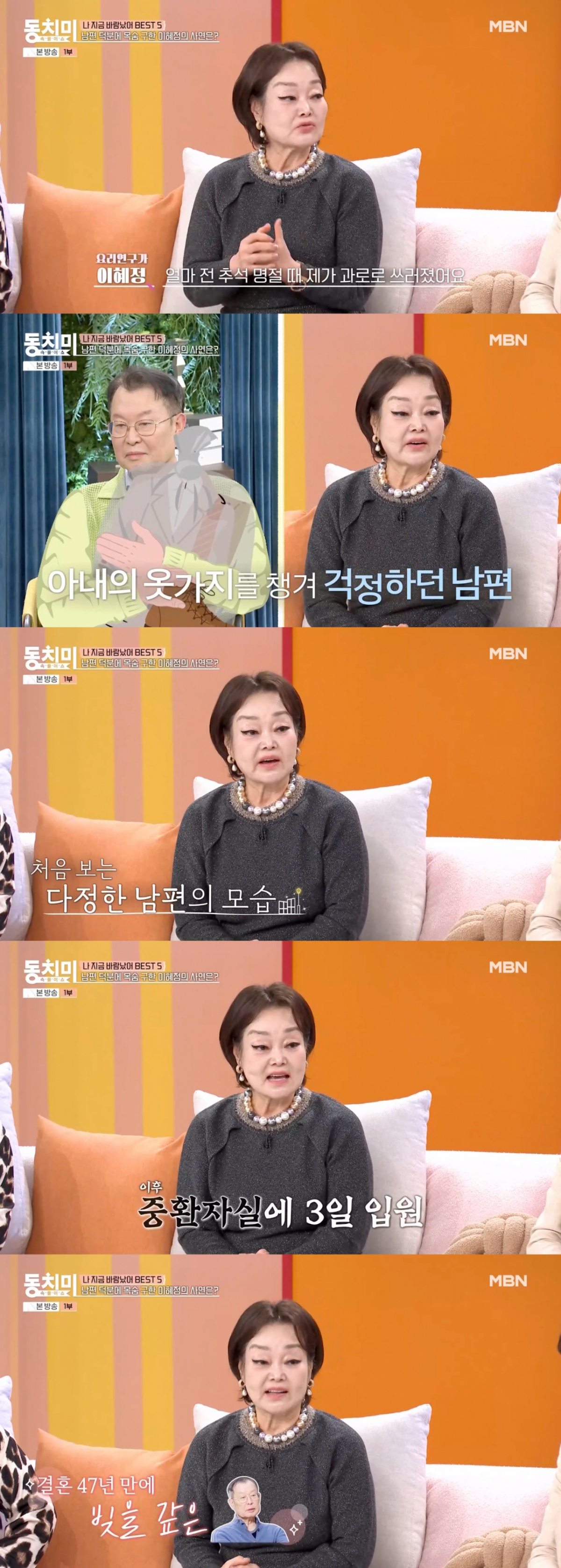 그러면서 "중환자실에 3일을 입원해 있었다. 결혼 47년 만에 남편이 빚을 갚은 것 같다. 이자에 원금까지 조금 갚은 거 같다. 의사가 '남편 덕 보신 줄 알아라'고 하시더라. 마냥 밉던 남편이 불썽해보이더라. 눈물이 막 났다"고 남편에게 고마운 마음을 드러냈다.
