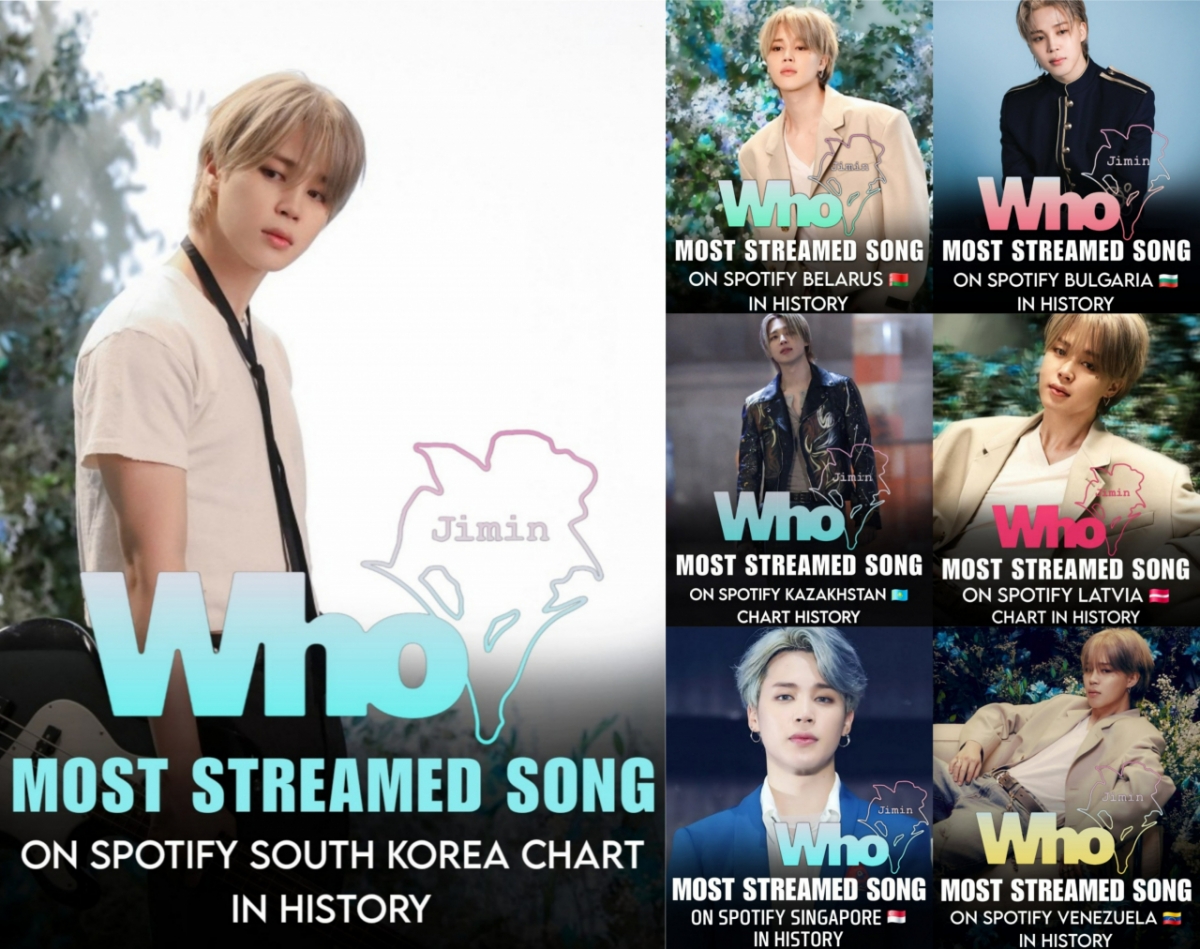 방탄소년단(BTS) 지민이 스포티파이(Spotify)에서 독보적 성과를 달성하며 K팝 대표 가수로 존재감을 빛내고 있다.지민의 정규 2집 타이틀곡 'Who'(후)는 스포티파이 국가별 차트 중 한국과 더불어 불가리아, 벨라루스, 카자흐스탄, 베네수엘라, 싱가포르, 라트비아까지 총 7개국에서 역대 최다 스트리밍 곡(Most Streamed Song)으로 기록됐다. 이는 K팝 가수 중 최초이자 유일한 성과다.