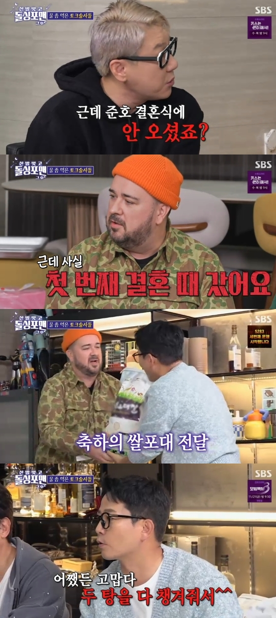 그러자 김준호는 "안 온 거로 퉁치자. 그만 얘기하라"라며 진땀을 흘렸다. 이때 샘 해밍턴은 "축의금 못 낸 대신 선물을 준비했다"며 쌀 한포대를 건네 화기애애한 분위기를 만들었다.