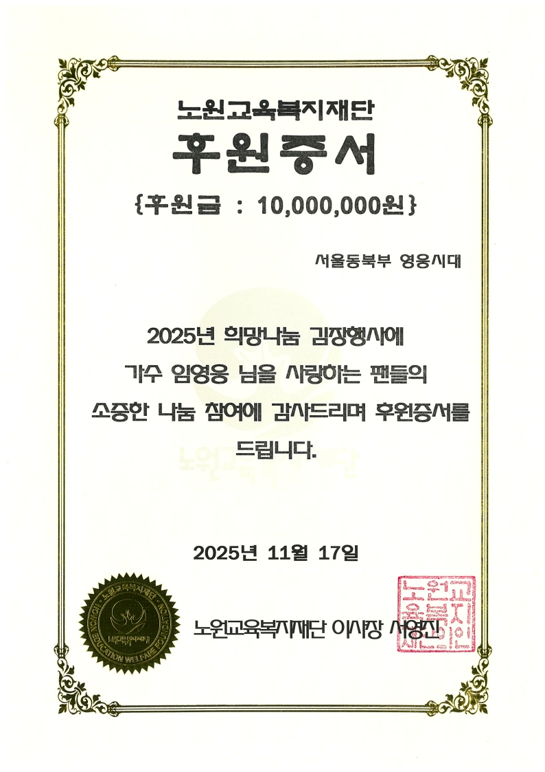 이날 서울 동북부영웅시대는 1000만원을 후원하고, 회원 42명이 직접 김장 작업에 참여해 일손을 보탰다. 팬클럽은 최근 임영웅이 두 번째 정규 앨범을 통해 다양한 음악적 스펙트럼을 선보이고, 2025년 전국투어 콘서트를 활발히 이어가며 대중에게 감동을 전하고 있는 만큼, 그가 베푸는 음악적 위로와 선한 영향력을 지역사회와 나누고 싶었다고 밝혔다.