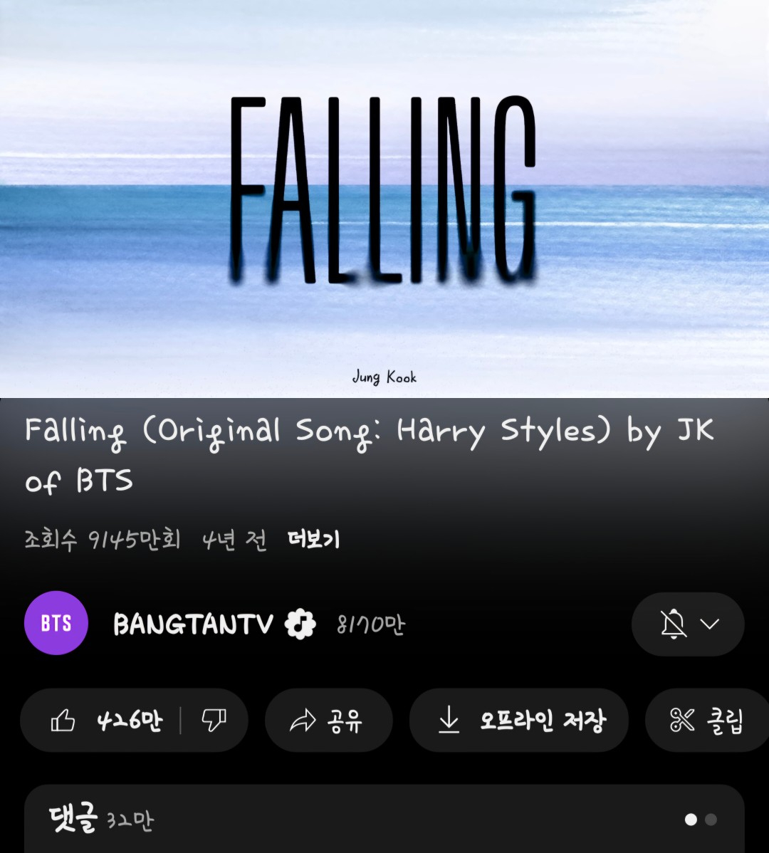 방탄소년단(BTS) 정국의 커버곡이 유튜브에서 꾸준한 글로벌 인기를 빛내고 있다. 정국이 방탄소년단 공식 유튜브 채널 '방탄TV'(BANGTANTV)를 통해 'Falling (Original Song: Harry Styles) by JK of BTS'이라는 제목으로 공개한 커버 오디오 영상은 최근 조회수 9000만을 돌파했다.