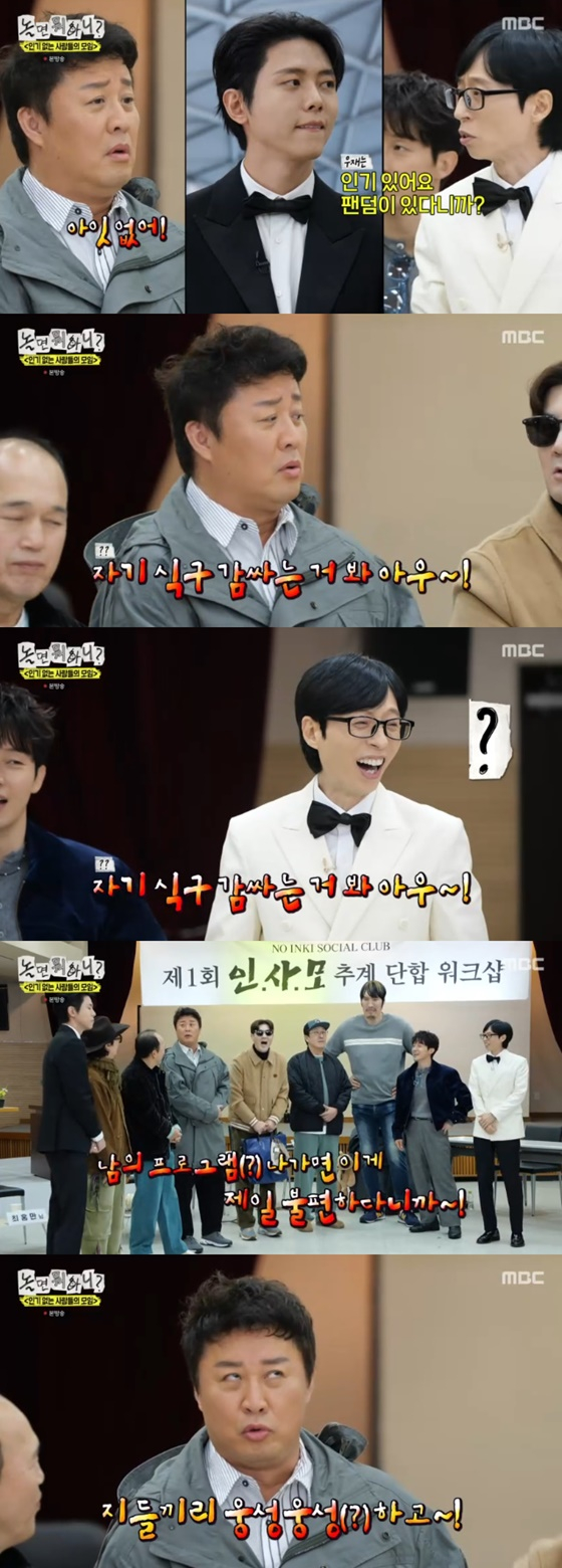 이날 '놀뭐' 고정 멤버인 모델 주우재가 짝다리를 짚어 지적을 당했다. '인사모' 회원인 배우 한상진은 "인기 좀 있다고 너무한 거 아니냐"고 농담을 건넸고, 이를 들은 정준하는 "쟤도 인기 없다"고 말을 보탰다.