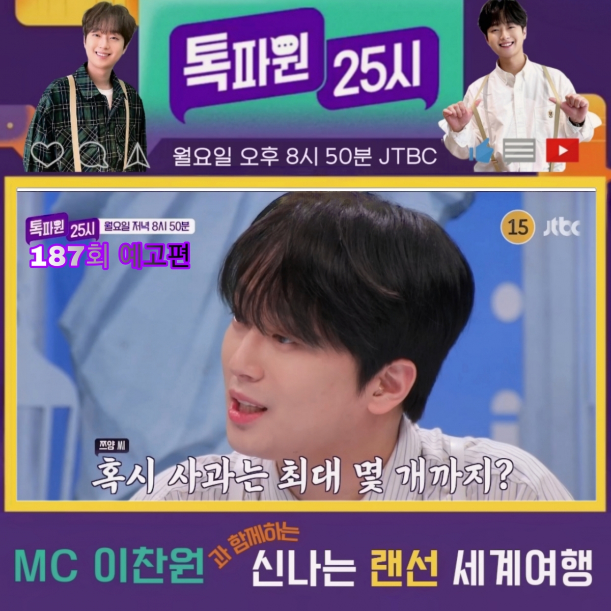 가수 이찬원이 흥미진진 불꽃 튀는 피자 대결 먹방으로 시청자를 유혹한다. 11월 24일 방송하는 JTBC '톡파원 25시'에서는 형형색색 컬러 투어, 피카소가 사랑한 현대 미술의 아버지의 미술의 세계, 미국과 일본의 물러설 수 없는 불꽃 튀는 피자 대결 등 다채롭고 흥미진진한 영상들이 펼쳐진다.
