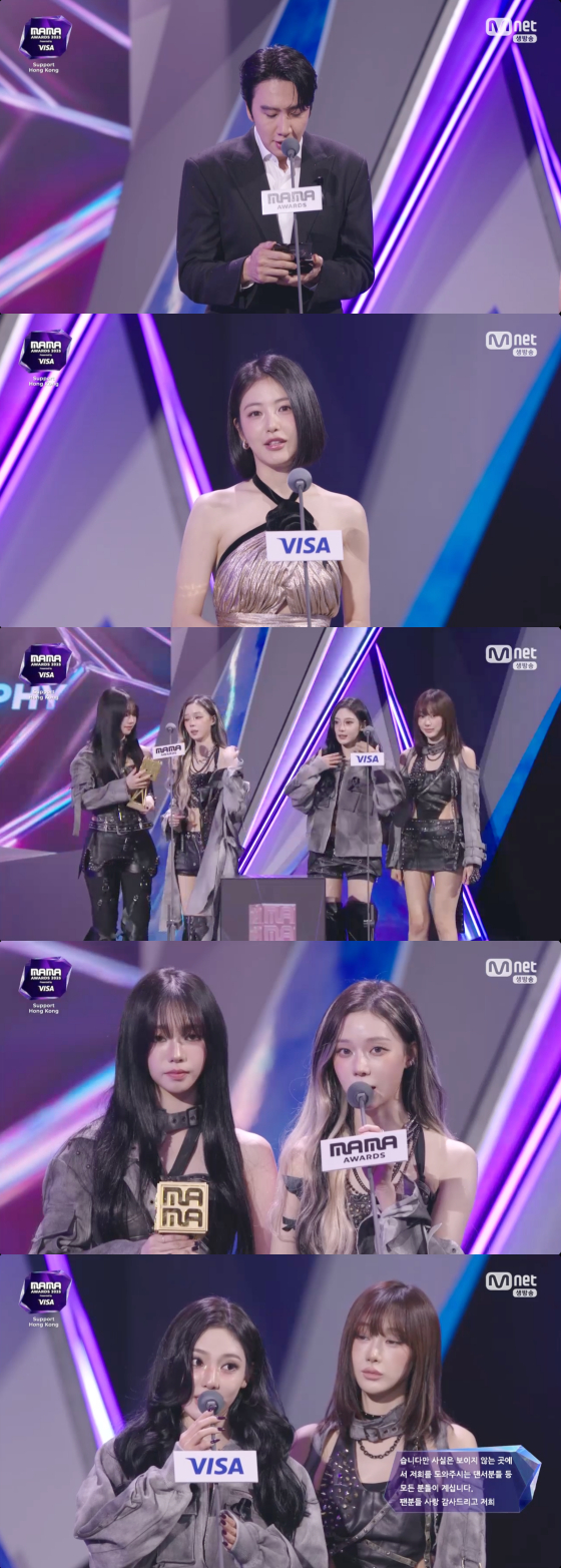 그룹 에스파가 '2025 마마 어워즈' 베스트 코레오그래피 부문을 수상한 가운데 홍콩 참사 희생자들을 애도했다.29일 오후 홍콩 카이탁 스타디움에서 '2025 마마 어워즈'(2025 MAMA AWARDS, 이하 '마마') 챕터 2가 개최됐다. 챕터 2는 배우 김혜수가 호스트로 나섰다.