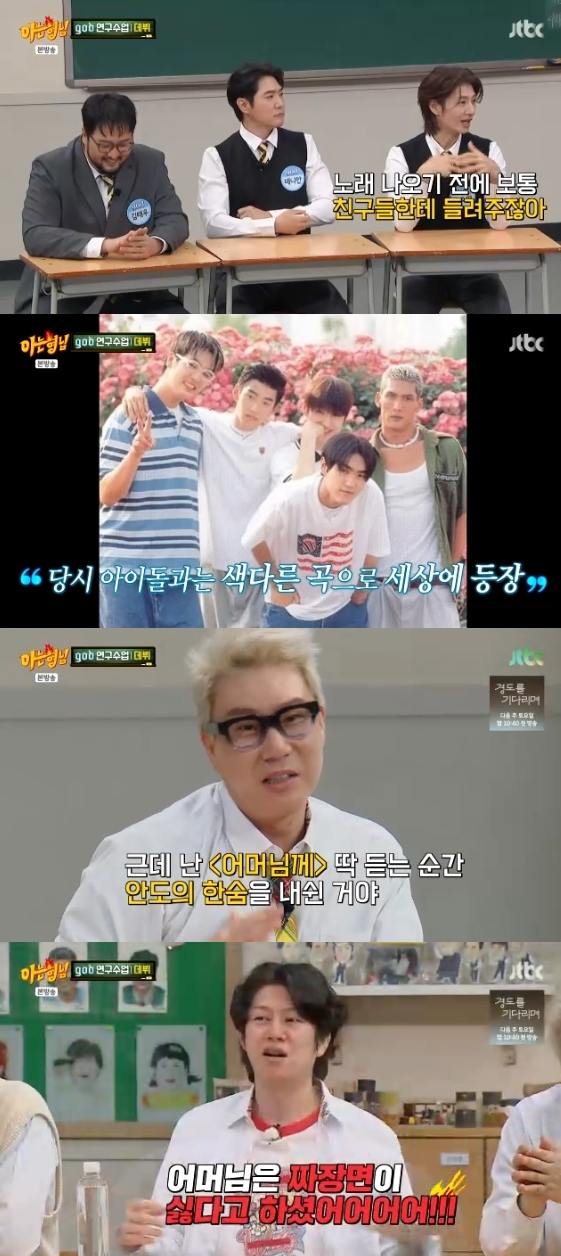 그룹 god가 정규 1집 타이틀곡 '어머님께'의 비화를 공개했다. 29일 방송된 JTBC 예능 프로그램 '아는형님'에는 데뷔 27년 차 국민 그룹 god의 김태우, 손호영, 데니안이 출연해 노련하고 센스 넘치는 입담을 풀어냈다.