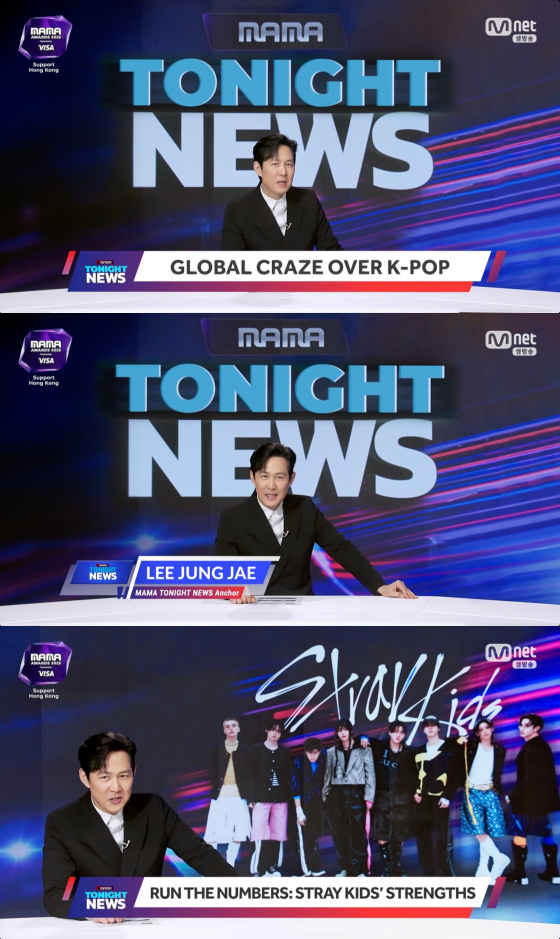 이날 이정재는 '마마 브레이킹 뉴스' 앵커 콘셉트 하에 영상으로 깜짝 등장해 관중들을 환호케 했다.
