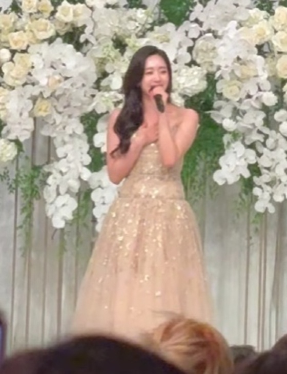 함은정은 앞서 스와로브스키가 박힌 6000만원 상당의 2부 드레스로 화제가 됐다. 이날 결혼식에서 그는 어깨가 드러난 베이지 톤의 화려한 드레스를 입어 눈길을 끌었다. 특히 그는 결혼식 2부에서 이선희의 '그중에 그대를 만나'를 열창하다 울컥하기도 했다.