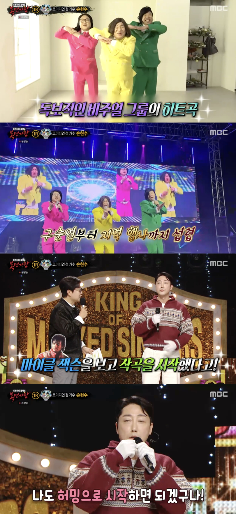 개그맨 손헌수가 작곡가로서의 반전 근황을 공개했다.30일 방송된 MBC 예능 프로그램 '복면가왕'에서는 '베개 싸움'와 '눈싸움'가 시인과 촌장의 '가시나무'를 듀엣곡으로 선곡해 감성 짙은 무대를 선보였다.