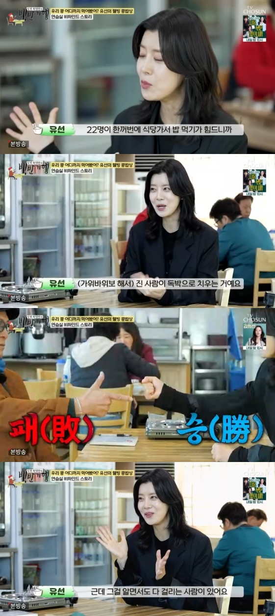 그는 연극 연습의 에피소드를 전하며 "저희끼리 하는 '가위바위보' 게임이 있다. 전체가 모이면 22명인데 다 같이 식당가서 밥 먹기 힘드니까 배달시키기도 한다. 가위바위보에서 진 사람이 알아서 독박으로 치우는 거다"라고 설명해 시선을 모았다. 그러면서 유선은 허영만에게 즉석 가위바위보 게임을 제안했다. 그는 "주먹 아니면 가위, 주먹 아니면 가위"라고 외치며 허영만의 정신을 분산시켰다.