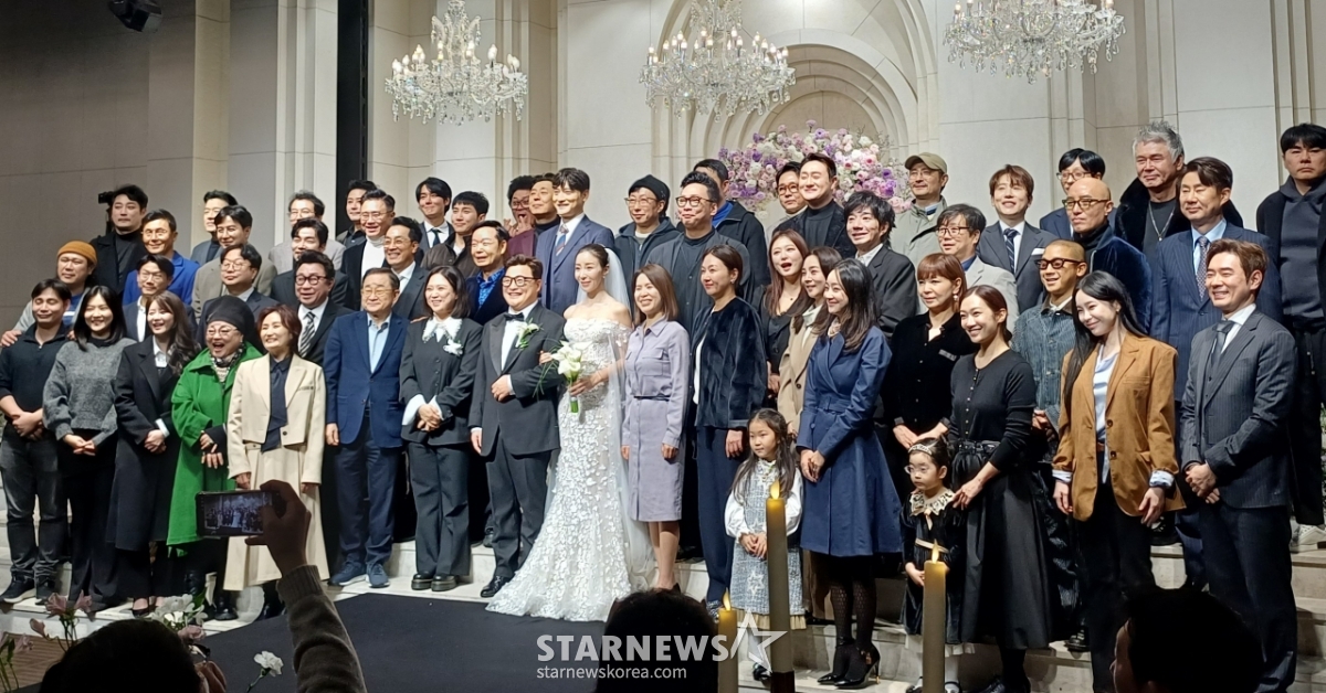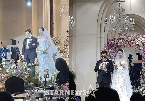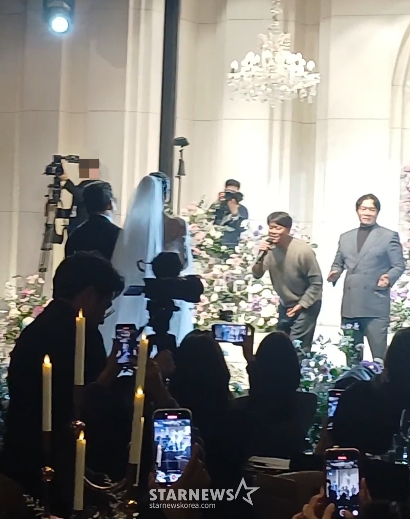 코미디언 윤정수(53)가 동료 연예인들의 열렬한 축하 속에 웨딩마치를 울렸다. 윤정수의 '가상 아내'로 각별한 인연을 이어온 후배 김숙도 결혼식 사회로 '가상 남편'의 앞날을 응원했다. 윤정수는 11월 30일 오후 6시 서울 강남의 한 호텔에서 방송인 출신 필라테스 강사 원진서(개명 전 원자현)와 백년가약을 맺었다. 결혼식을 앞두고 체중 20kg을 감량했다는 그는 멋진 턱시도 차림으로 흥겹게 춤을 추며 하객들 앞에 섰다. 이어 날렵하게 옆 구르기까지 하며 하객들의 호응을 유도했다.