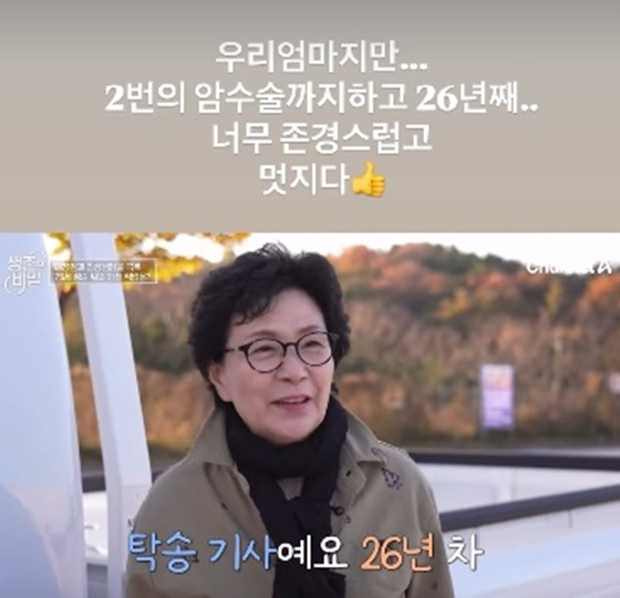 안무가 배윤정의 어머니가 대장암, 감상샘암을 이겨낸 탁송 기사로 방송에 출연해 화제다.지난 2일 채널A '생존의 비밀'에서는 대장암과 갑상샘암을 극복한 75세 이정순 씨의 사연이 공개됐다.