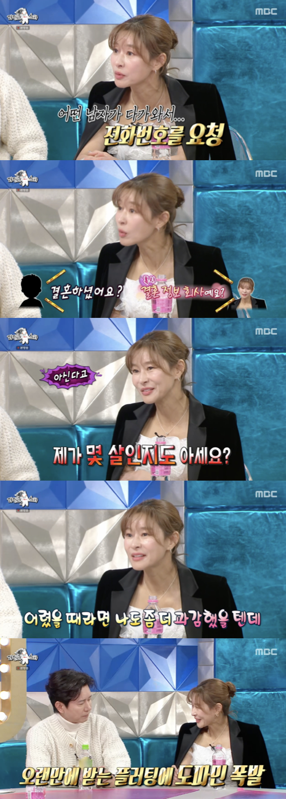 배우 예지원이 최근 번호를 물어보는 일을 겪었다며 오랜만의 설렘을 전했다.3일 방송된 MBC 예능 프로그램 '라디오스타'(이하 '라스')는 '솔로의 품격' 특집으로 꾸며져 김민종, 예지원, 김지유, 말왕이 출연했다.