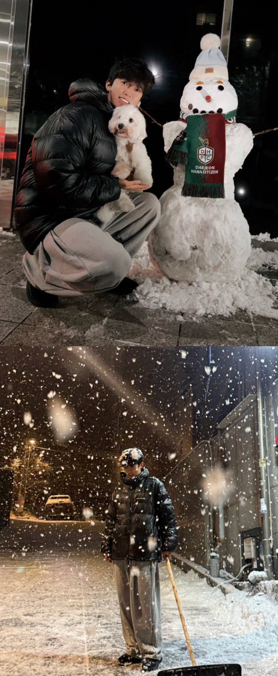 반려견과 함께 찍은 사진도 공개했다. 임영웅은 반려견을 품에 안고 작은 눈사람과 인증샷을 남겨 훈훈함을 자아냈다.