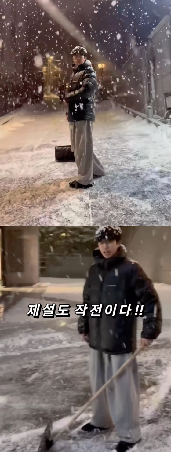 임영웅은 "눈길 운전 조심하셔라. 눈이 돌아서면 쌓이고, 돌아서면 쌓인다"고 말했다.이어 "제설도 작전이다. 내 집 앞 눈은 내가 치우자"고 외쳤다.