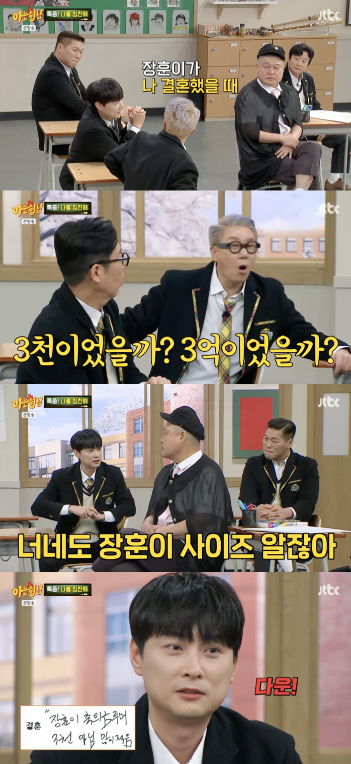 이날 민경훈은 "루머가 계속 돌고 있다. 그걸 바로잡아야 할 필요성이 있어 보인다"며 "내가 결혼했을 때 장훈이가 축의금을 3천만 원 냈다는 소문이 SNS로 돌고 있다. 그런데 너희들도 장훈이 사이즈 알지 않냐. 3천이었을까? 3억이었을까?"라고 농담을 던져 현장을 웃음바다로 만들었다.이어 그는 "다들 오해하니까, 3천만 원이라는 오해를 풀고 싶었다"며 "3천보다 많이 적음"이라고 정정해 또 한 번 폭소를 자아냈다.
