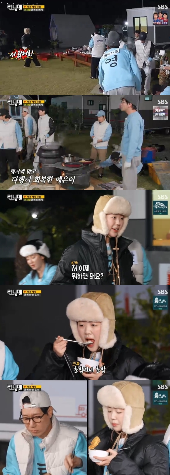 방송인 지예은이 병원 치료 후 촬영장에 복귀해 원조 '먹짱'의 면모를 드러냈다. 7일 방송된 SBS 예능 프로그램 '런닝맨'은 지난주에 이어 '낭만 이 맛 아닙니까 下'편으로 꾸며진 가운데 통영 '통'으로 불리는 허경환이 게스트로 참여해 멤버들과 함께 낭만 여행을 즐기는 모습이 그려졌다.