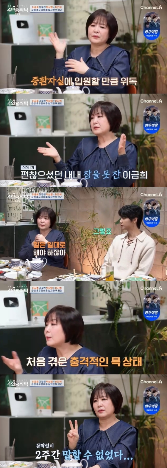 아나운서 이금희가 어머니의 병간호 후 목소리를 잃을 뻔한 사연을 털어놨다. 8일 방송된 채널A 예능 프로그램 '절친 도큐멘터리 4인용식탁'에는 아나운서 이금희가 절친인 박상영 작가, 가수 겸 배우 이진혁을 초대해 진솔한 대화를 나눴다.