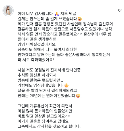이후 한 네티즌이 댓글을 통해 정숙과의 결혼식 날짜를 3주 간격으로 잡았는지 물었고 이에 영자는 "제가 먼저 결혼 결정을 했던 건 사실인데 정숙님이 출산 후에 결혼하면 왠지 마음이 한편으로 서운할 수도 있겠거니 생각해서 얼른 먼저 잡으라고 말했다. 출산 후에 너무 힘들어서 결혼 생각 못 하면 영영 미뤄질 것 같았다"라며 "정숙이도 착해서 너무 붙여서 최대한 안 하겠다고 말해주는데 둘 다 좋은 사람과 다시 행복 찾는 거라 서로 축하해 줬다"고 답했다.