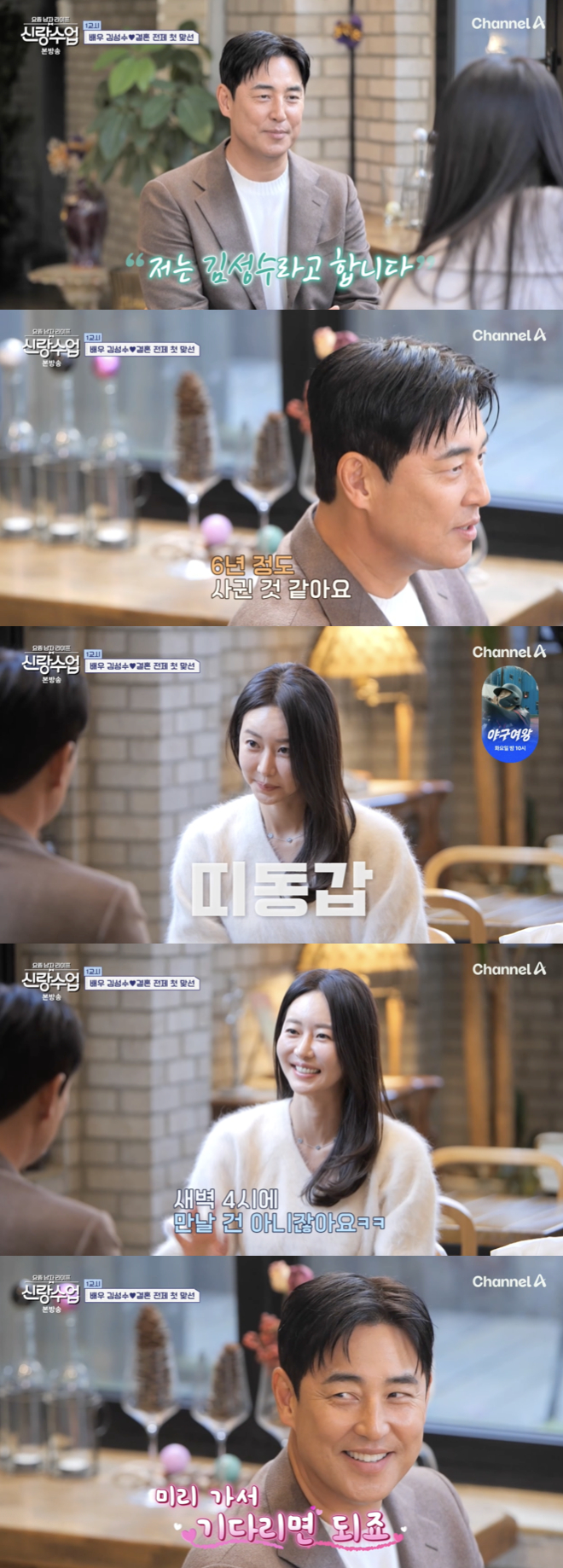 배우 김성수가 띠동갑 상대와 첫 맞선에 나섰다.10일 방송된 채널A 예능 프로그램 '요즘 남자 라이프 - 신랑수업'에서는 모델 겸 쇼호스트 박소윤과 함께 맞선을 보는 김성수의 모습이 공개됐다.