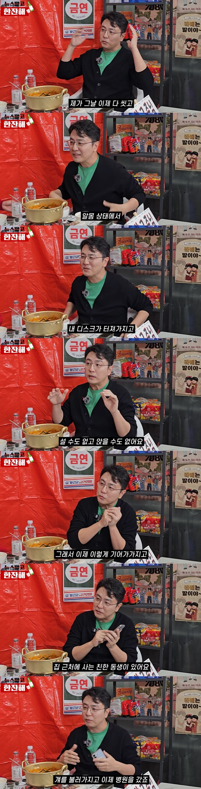 그는 "갑자기 기침이 나와서 기침을 하다가 디스크가 터졌다. 그래서 (김현욱) 혼자 밥을 먹었다. 미안하다"라고 말했다.