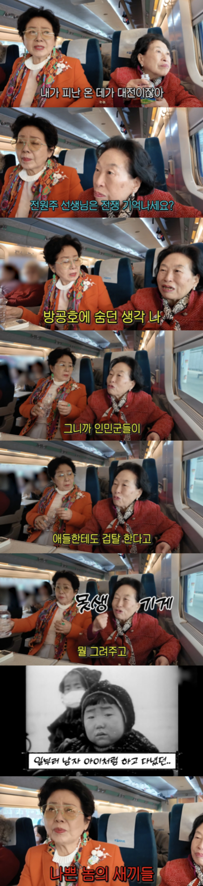 이날 영상에서 선우용여와 전원주는 울산으로 향하는 KTX에 함께 올랐다. 대전역을 지나던 중 선우용여는 "내가 피난 온 곳이 대전이다"라고 말하며 전쟁 당시를 떠올렸다.
