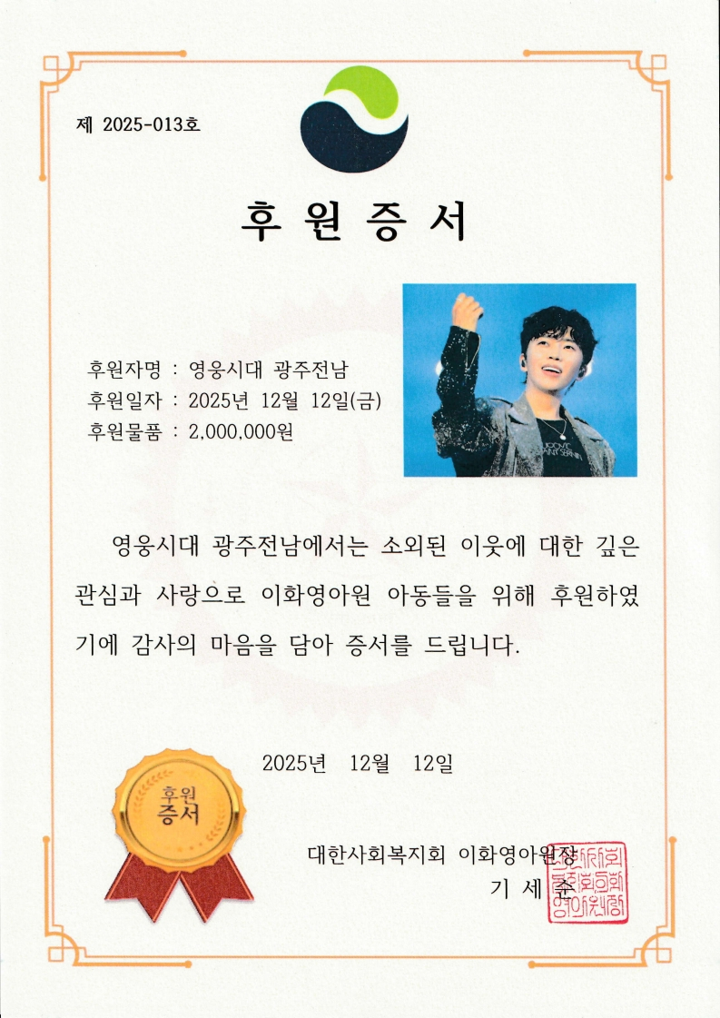 영웅시대 광주전남은 2023년부터 이화영아원과 인연을 맺은 후 매년 꾸준한 나눔을 이어오고 있다. 가정의 달 물품 후원과 보육 봉사활동을 비롯해 올해도 김장김치 후원과 봉사활동으로 아이들의 건강한 겨울나기를 돕고 있다.팬클럽 관계자는 "겨울이 오면 아이들 생각이 가장 먼저 난다. 아이들이 김치를 좋아하며 잘 먹는다는 이야기에 올해도 자연스럽게 마음이 향했다"며 "서로의 따뜻함을 나눌 수 있는 시간이 되어 감사하다"고 밝혔다.